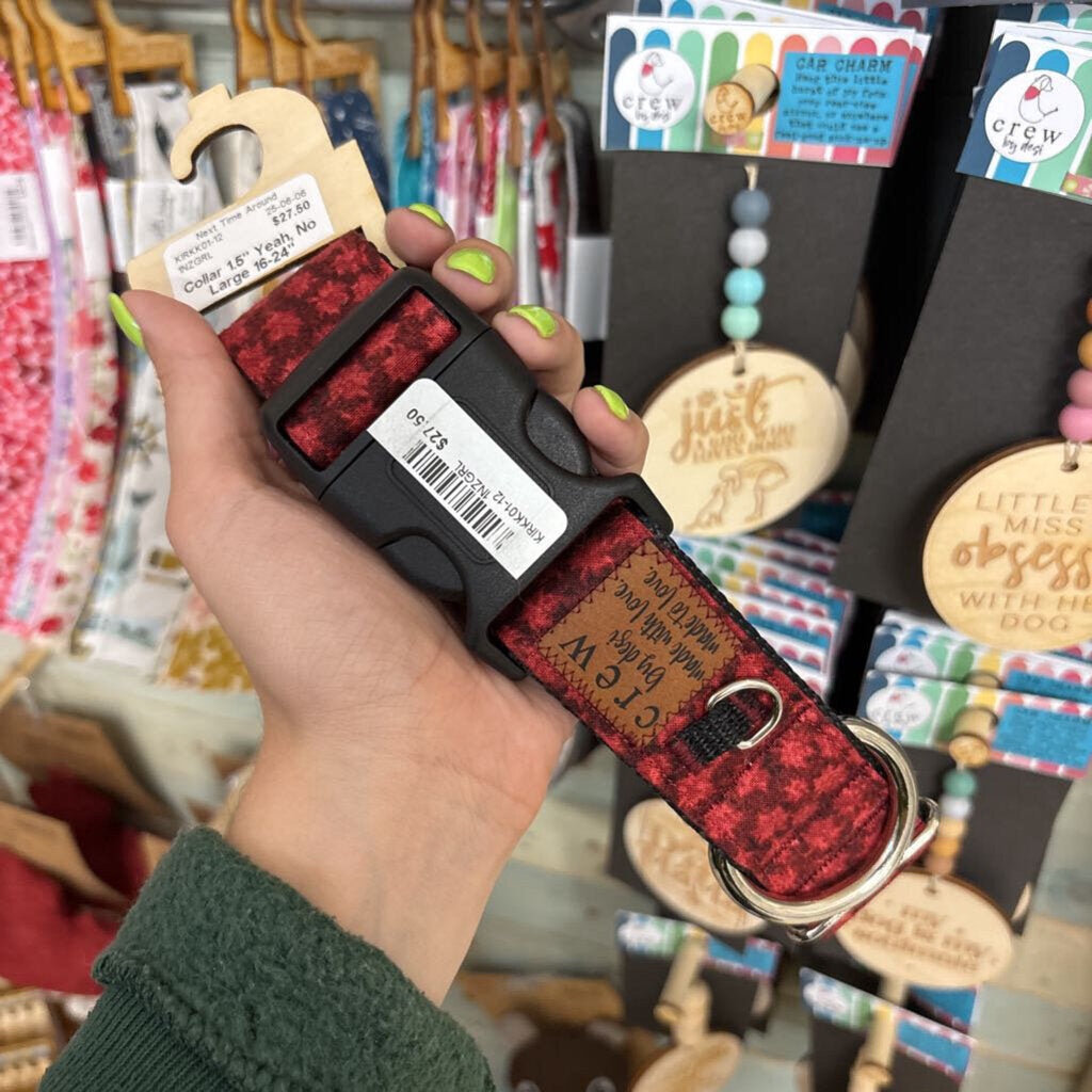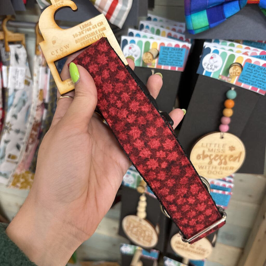 Imagine your furry friend looking stylish and feeling secure in a collar that's both durable and comfortable. At Crew by Desi, we believe your bestie deserves the best, so we craft each collar with the utmost care and attention to detail. Our collars are made from high-quality materials, including a 100% cotton exterior and a strong nylon webbing interior. We use double lines of zig-zag stitching to secure hardware. A separate tag ring is included on all collars to easily attach an ID tag (and help reduce the jingle noise). Collars are treated with an eco-friendly stain deterrent spray and are hand washable. Use a mild detergent (i.e. Dawn dish soap) and soft brush, and lay flat or hang to dry. Enjoy all of the adventures and snuggle time with your well-dressed pal. Please remove collar during rough play, when unsupervised, or while pet is in crate/kennel. Made with love. Made to love. Proudly Canadian. Small 10-14" Med 12-18" Lg 16-24" XL 20-26"