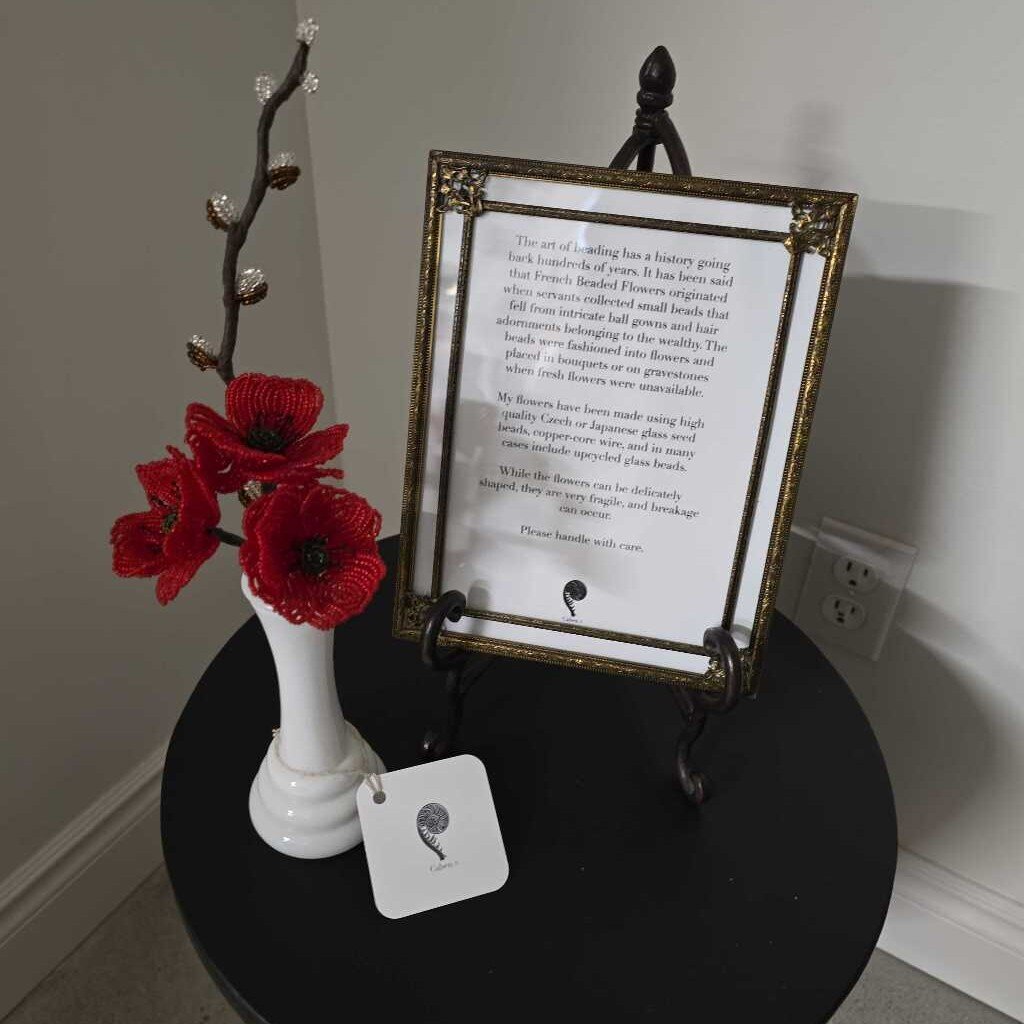 Handcrafted Glass Bead Poppy Trio w/ Catkin in Vtg Milkglass Vase