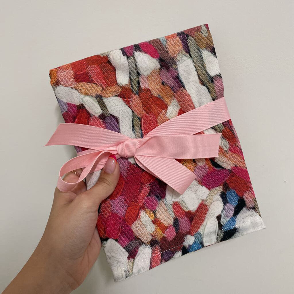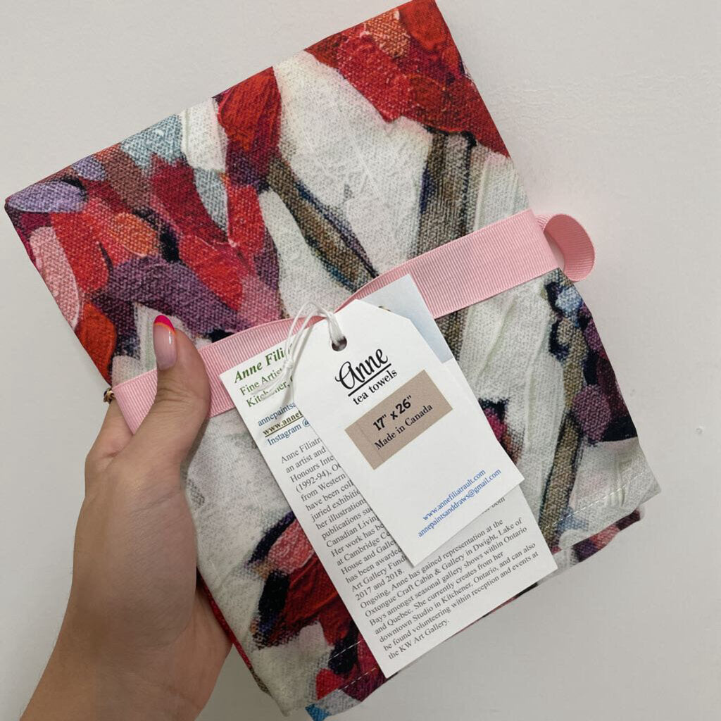 Cotton Linen canvas fabric, Anne's custom art designs that are printed with permanent vibrant inks ready to withstand lots of washing and utility. Great hang loop on the back for hanging up to dry. Made in Montreal, Canada