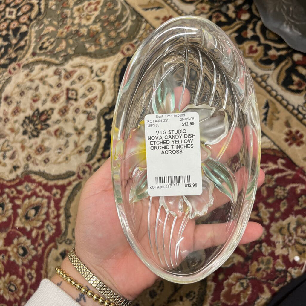 VTG STUDIO NOVA CANDY DISH ETCHED YELLOW ORCHID